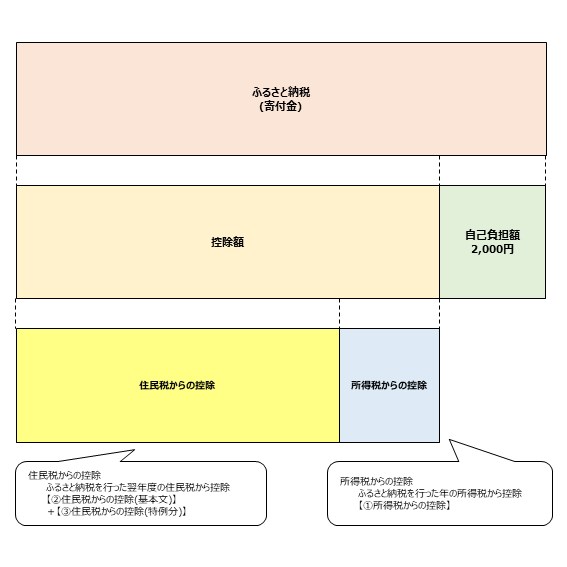住民税からの控除には「基本分」と「特例分」があり、それぞれ以下のように決まります。 - 住民税からの控除(基本分)=(ふるさと納税額-2,000円)×10%