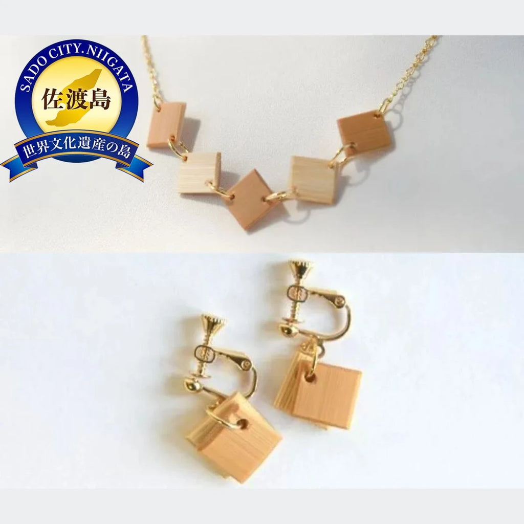 軽くて肌当たりの良い、竹のネックレスとイヤリングのペア商品です。